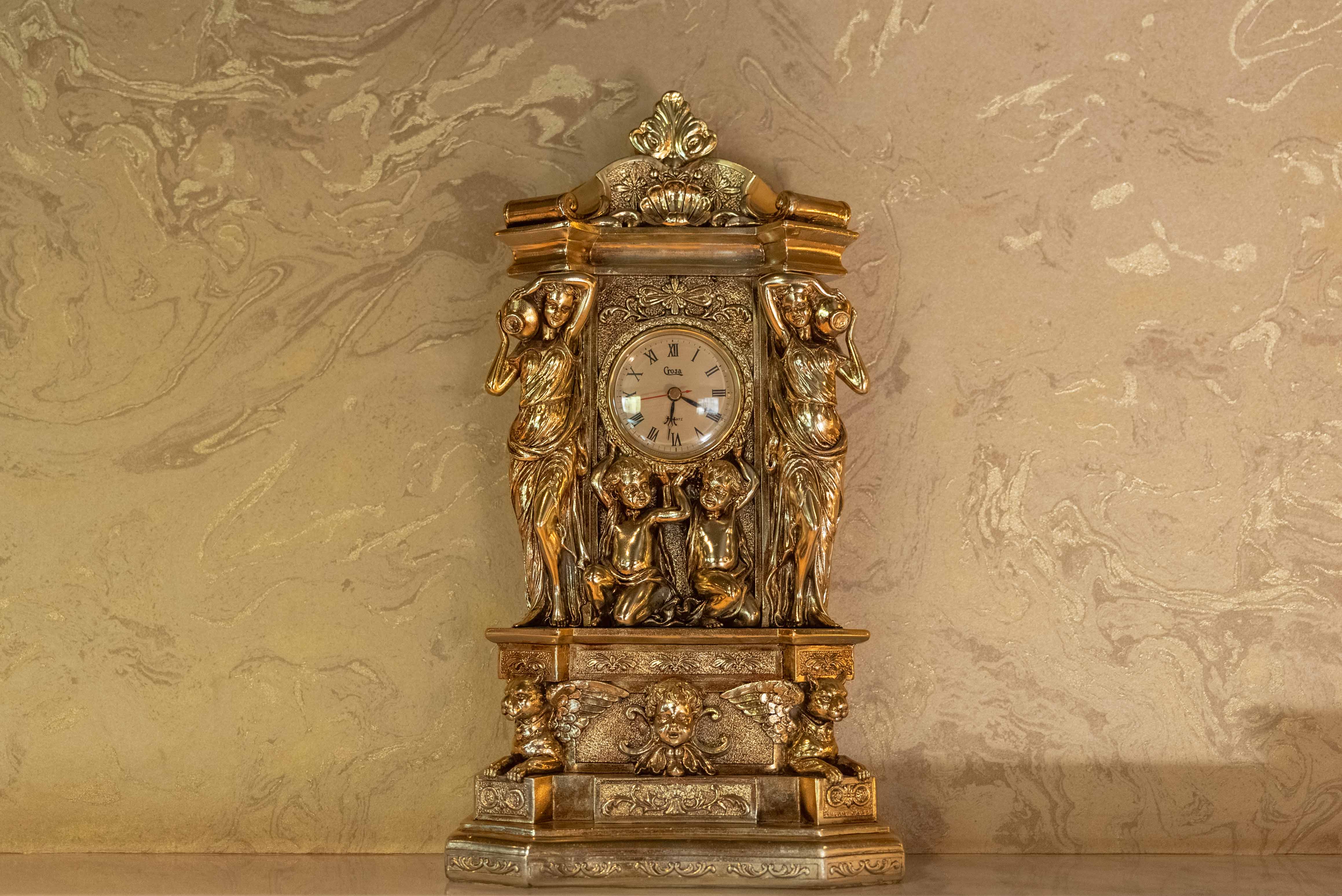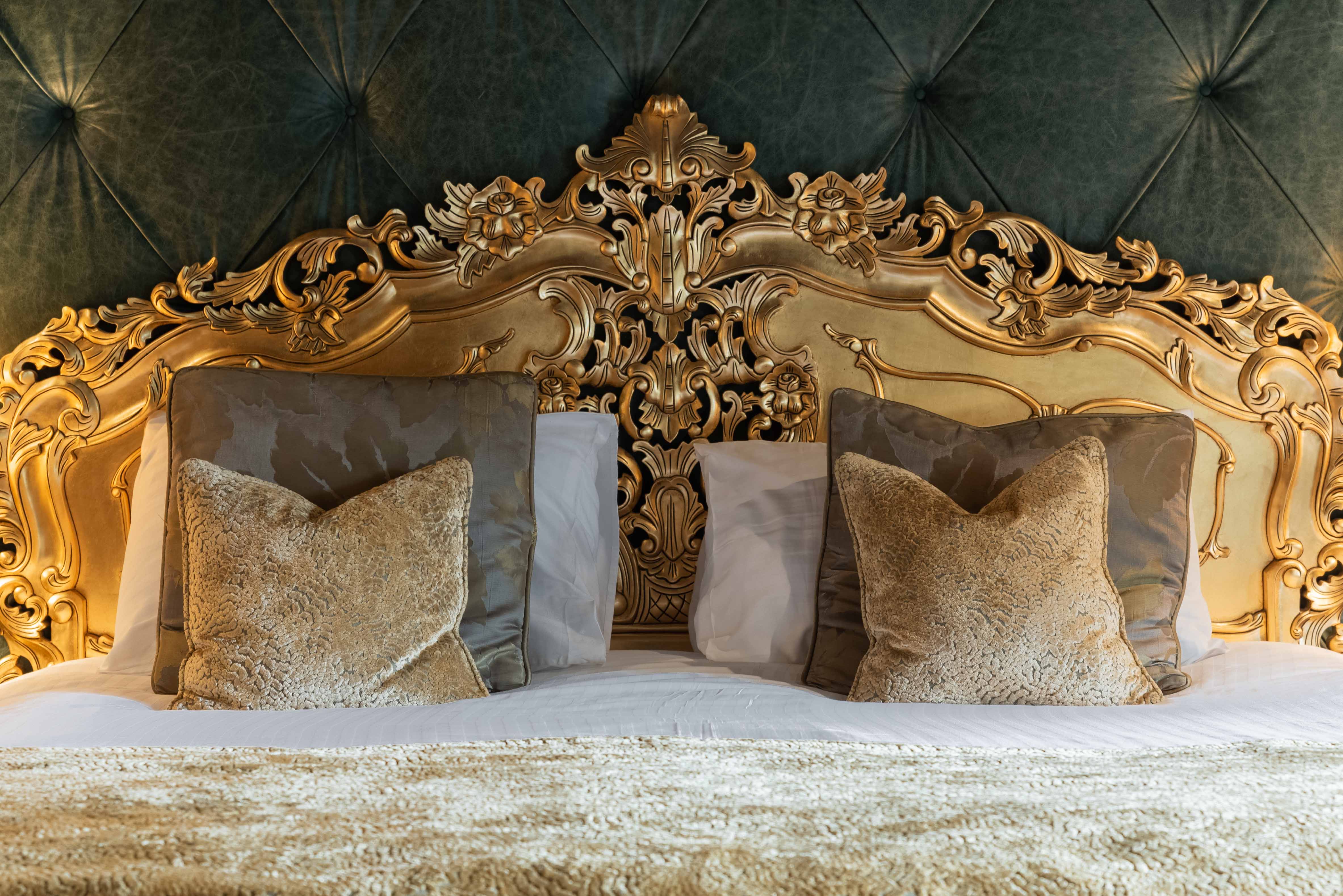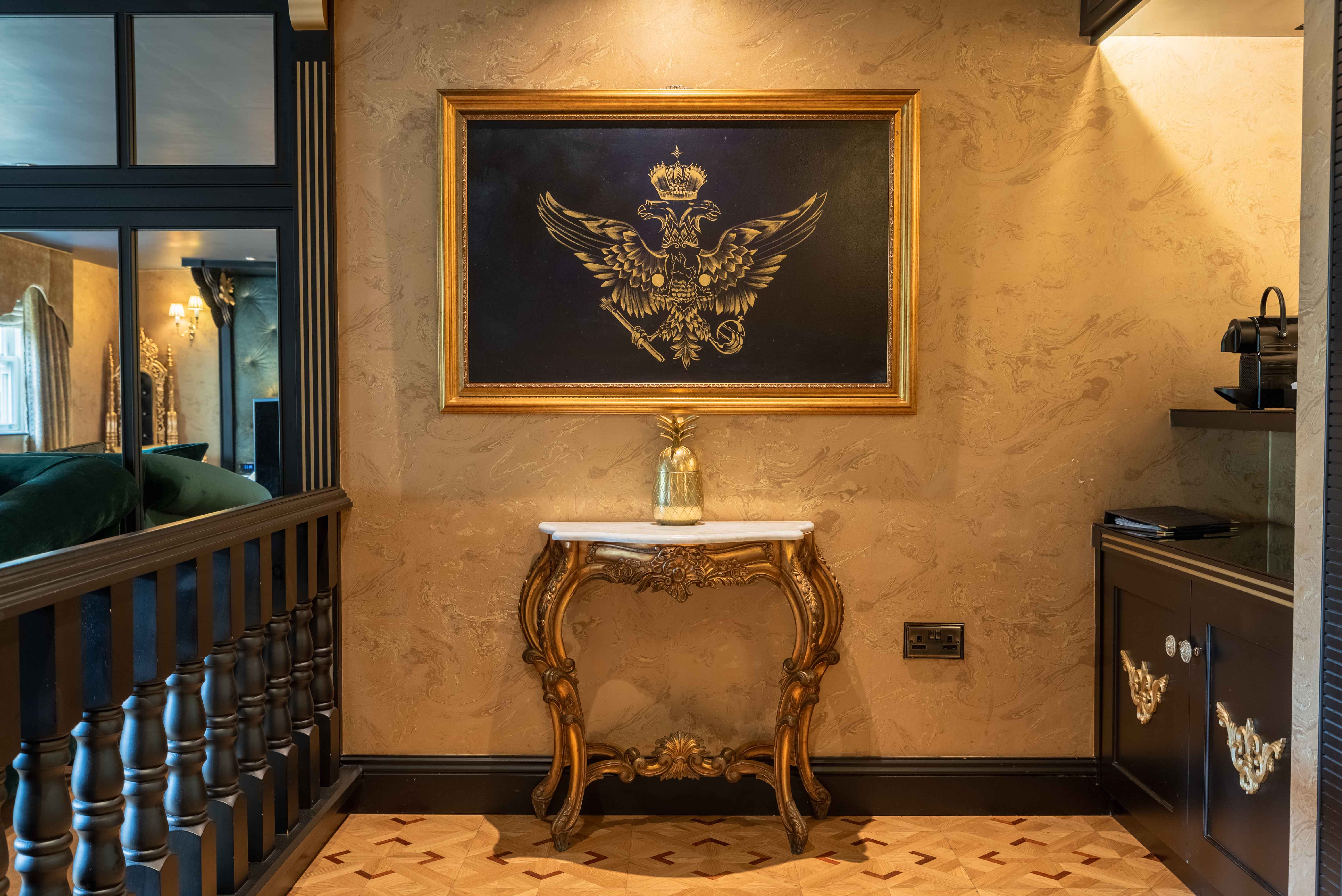 Russia is known for its opulent high-class décor, with that, no expense has been spared to create a taste of splendour in this luxurious suite. The walls are adorned with deep green leather and mirrored panels, topped with beautiful gold corbels and detailing.