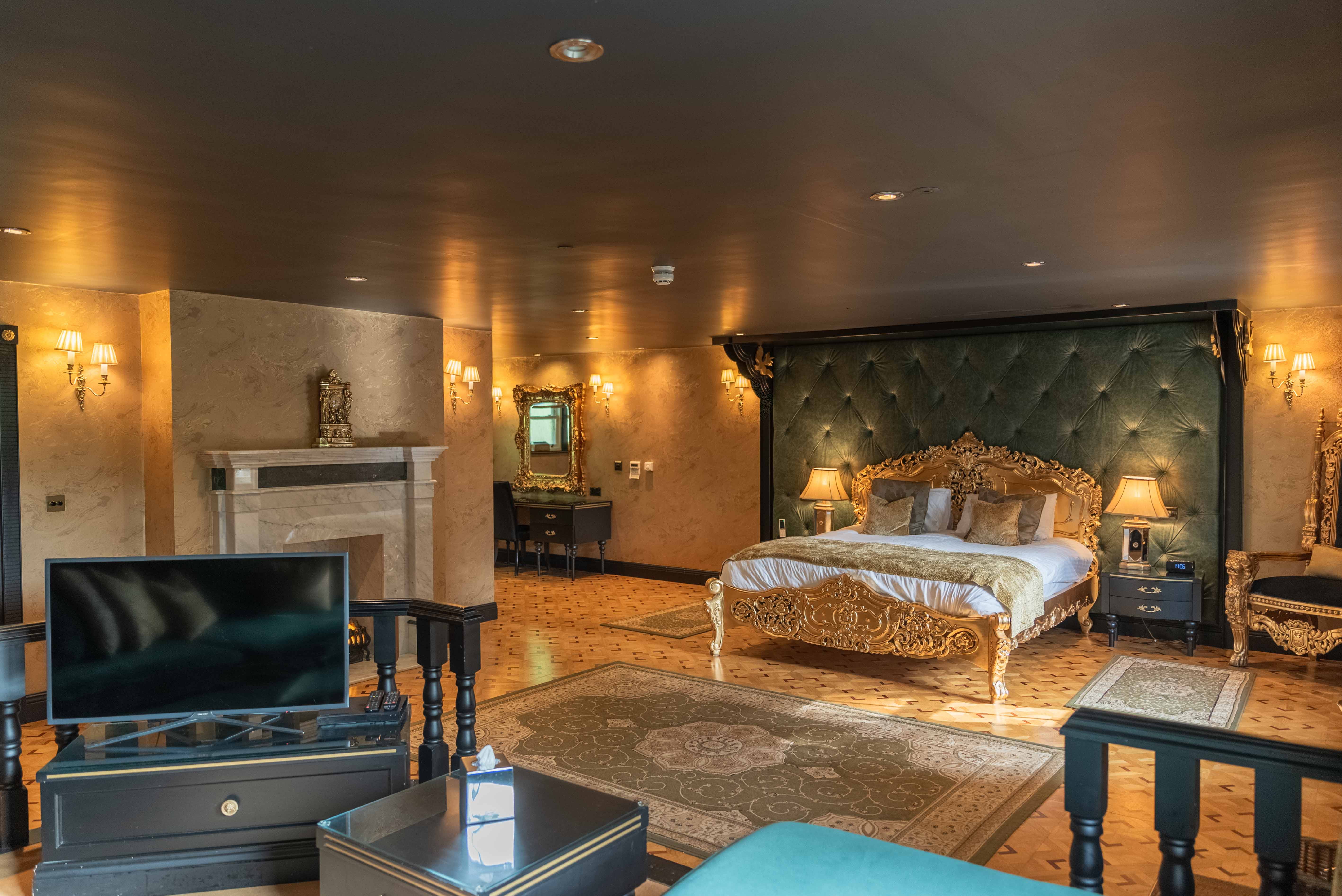 Russia is known for its opulent high-class décor, with that, no expense has been spared to create a taste of splendour in this luxurious suite. The walls are adorned with deep green leather and mirrored panels, topped with beautiful gold corbels and detailing.